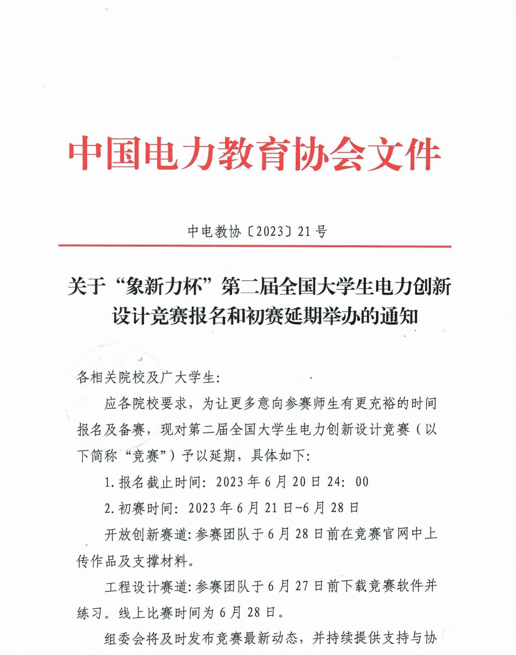 全国大学生电力创新设计竞赛报名和初赛延期举办的通知 发布时间:2023-05-31 19:34 浏览量:2567 附件:中电教协(2023)21号文关于”象新力杯“第二届全国大学生电力创新设计竞赛报名和初赛延期举办的通知.pdf