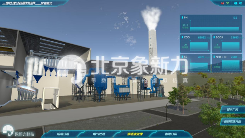 北京象新力根据《三废处理工程技术手册》等课程的教学内容,以国内先进的生活垃圾处理处置方法为设计原型,研发了环境工程三废处理虚拟仿真软件,模拟实际的垃圾焚烧工艺,以及二次污染物处理工艺,提供真实的工程场景实验平台,提高学生实际工程能力,培养创新意识。
