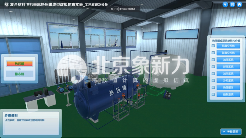 为此,北京象新力自主研发了“复合材料飞机垂尾热压罐成型虚拟仿真软件”。软件以碳纤维增强环氧树脂复合材料在飞机垂尾上的应用为例,通过虚拟仿真实验的操作与学习,帮助学生全方位掌握复合材料典型制备工艺,为复合材料高端制造领域的研究与应用工作奠定坚实的综合能力基础。
