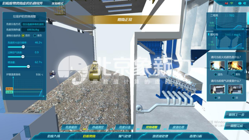 在焚烧调整环节中,可自行选择危险废物分选方式和危险废物组分含量。并通过实验学习和认识在焚烧之前焚烧物的热值测定过程。在焚烧过程中,根据选择危险废物的状态展现不同焚烧炉的效果,并可调节焚烧炉参数来调整焚烧炉的燃烧温度,并以此调节焚烧中产生的烟气污染物浓度。