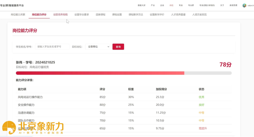 在智慧课程和虚实融合实训双轨支撑下,形成“教学-考核”完整闭环,由AI学伴和AI评价全程赋能。以最终的岗位能力为目标培养学生,实现从能力分析到人才培养的系统化解决方案。