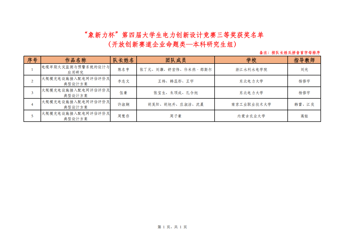 第四届大学生电力创新设计竞赛开放创新赛道企业命题类决赛名单及三等奖获奖名单公示