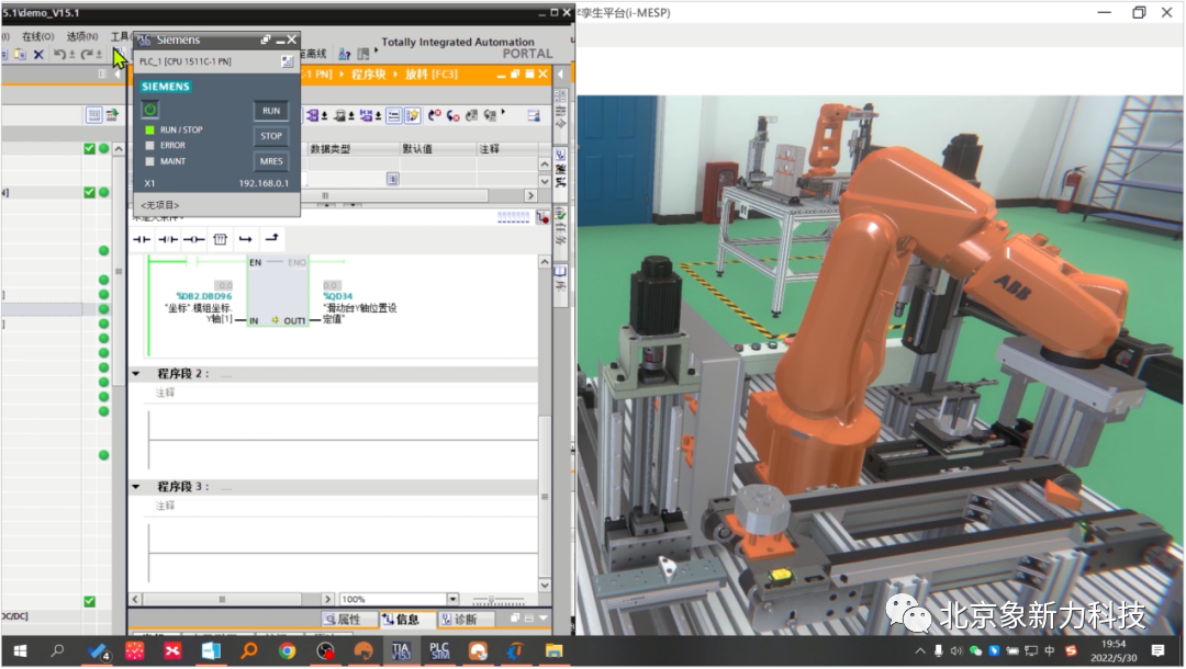 4、与真实工业系统及软件之间进行通讯、控制:可与真实PLC(西门子、三菱等)硬件及软件进行连接,可借助平台进行PLC编程练习、典型电气控制系统故障排查等实验及实训,以及无缝衔接工业控制系统(ABB机器人系统、MES系统等)。