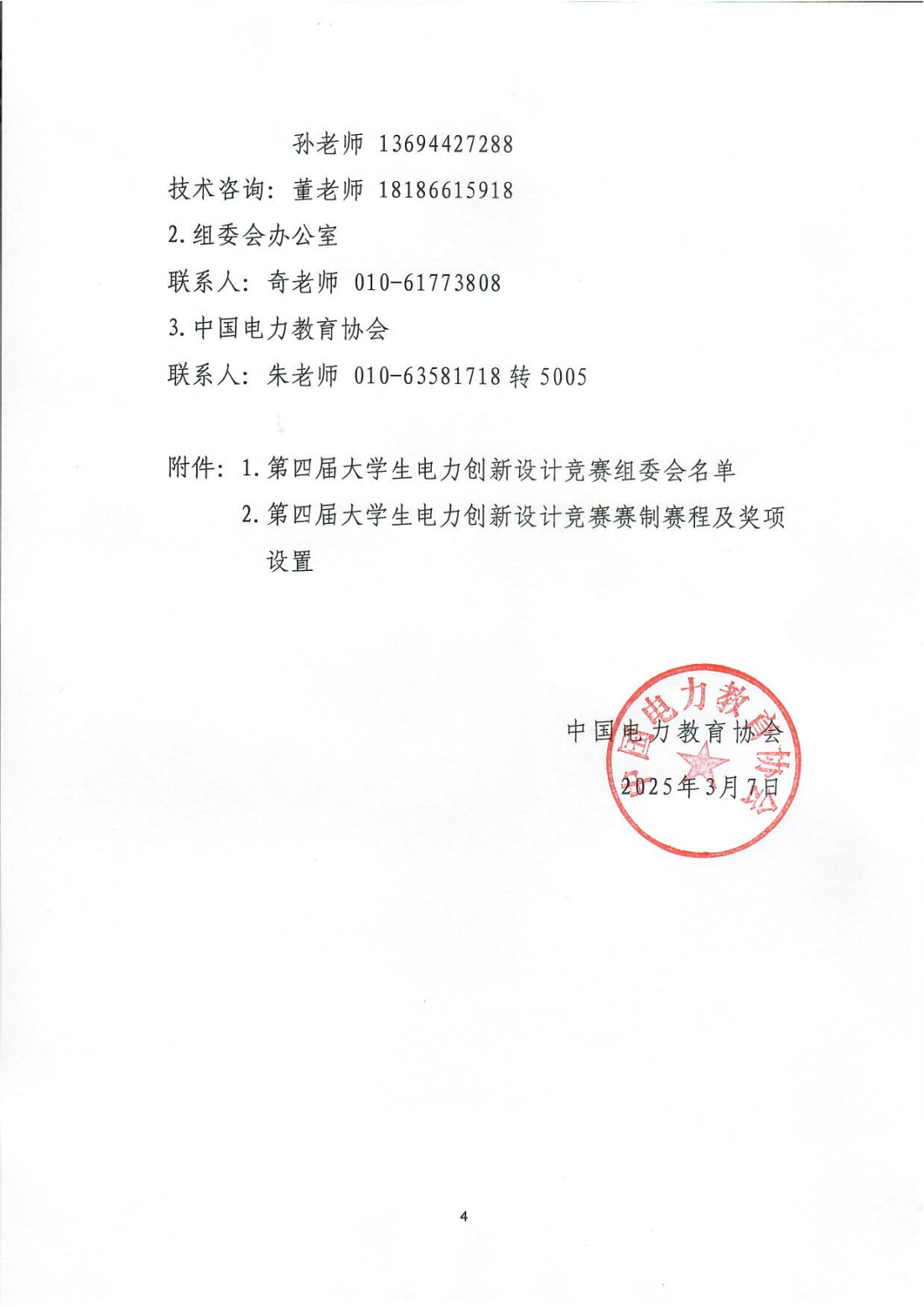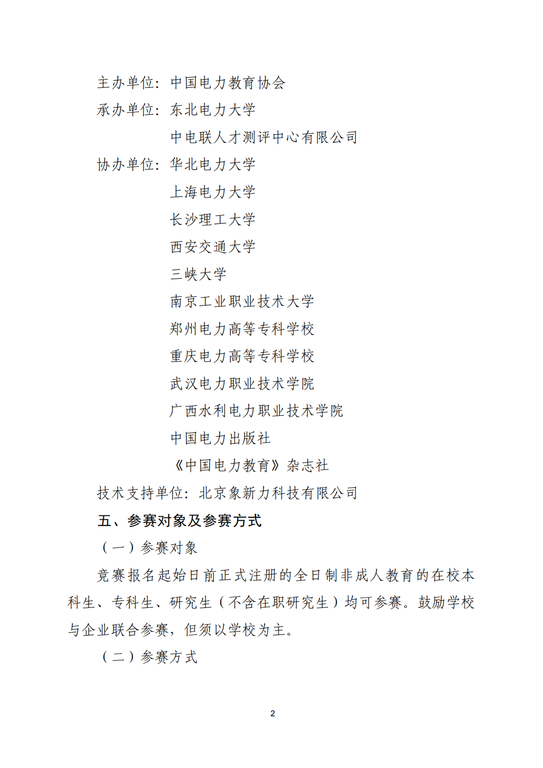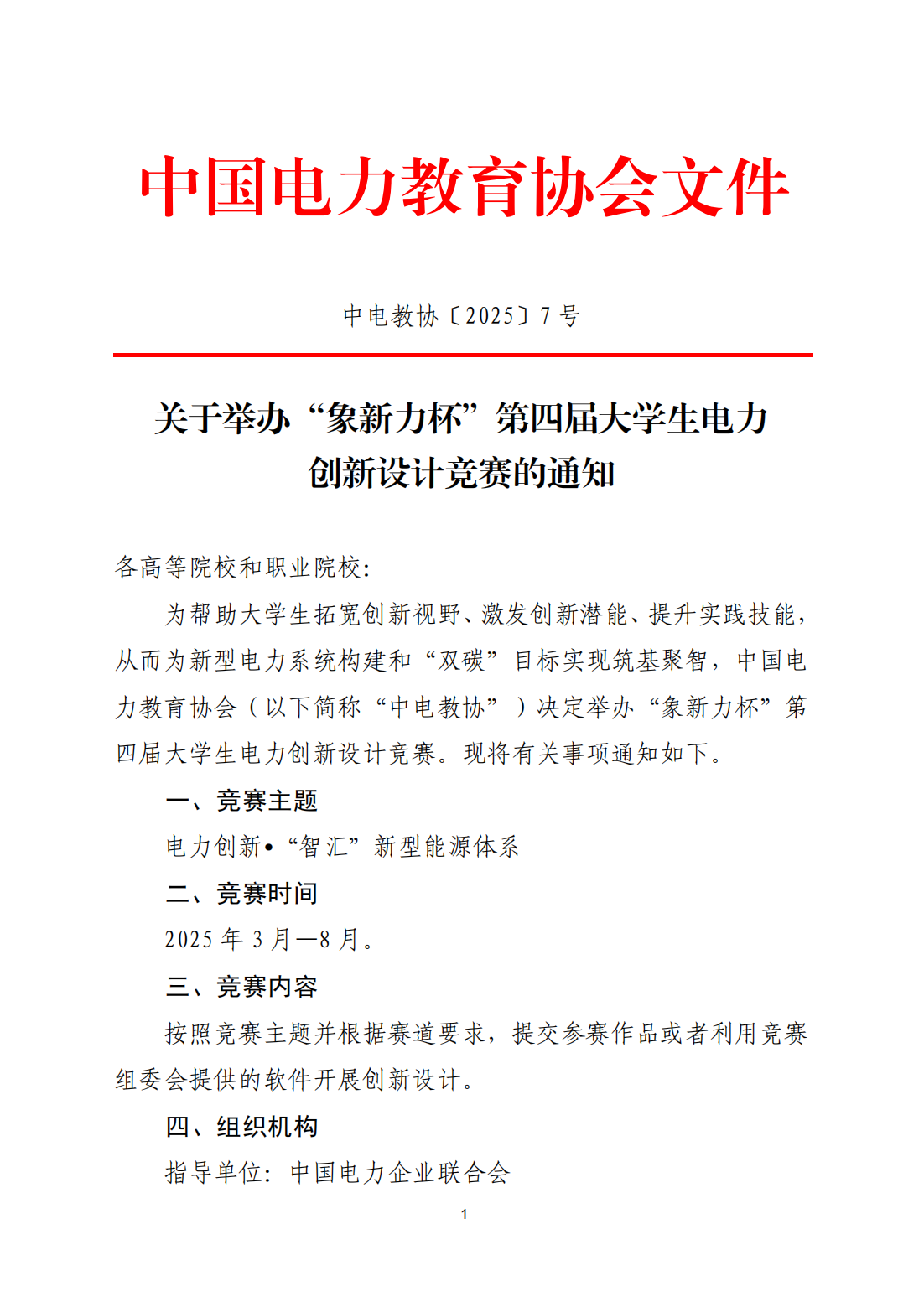 以“电力创新 • '智汇' 新型能源体系”为主题,由中国电力企业联合会为指导单位,中国电力教育协会主办,东北电力大学和中电联人才测评中心有限公司共同承办,华北电力大学、上海电力大学、长沙理工大学、西安交通大学、三峡大学、南京工业职业技术大学、郑州电力高等专科学校、重庆电力高等专科学校、武汉电力职业技术学院、广西水利电力职业技术学院、中国电力出版社、《中国电力教育》杂志社协办,北京象新力科技有限公司提供技术支持的“象新力杯”第四届大学生电力创新设计竞赛定于2025年3月-8月举办,现将有关事项通知如下: