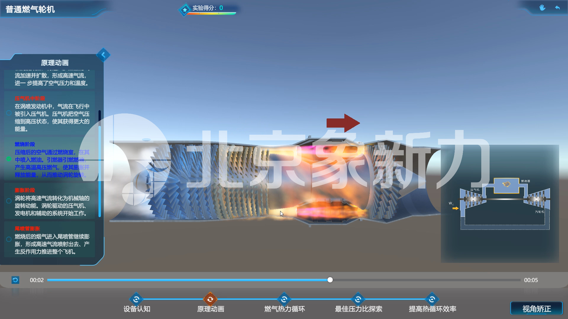 “燃气轮机”模块可学习飞机发动机设备结构、系统运行原理,可进行燃气热力循环的性能参数的探索,可将理论循环和实际循环进行比较。