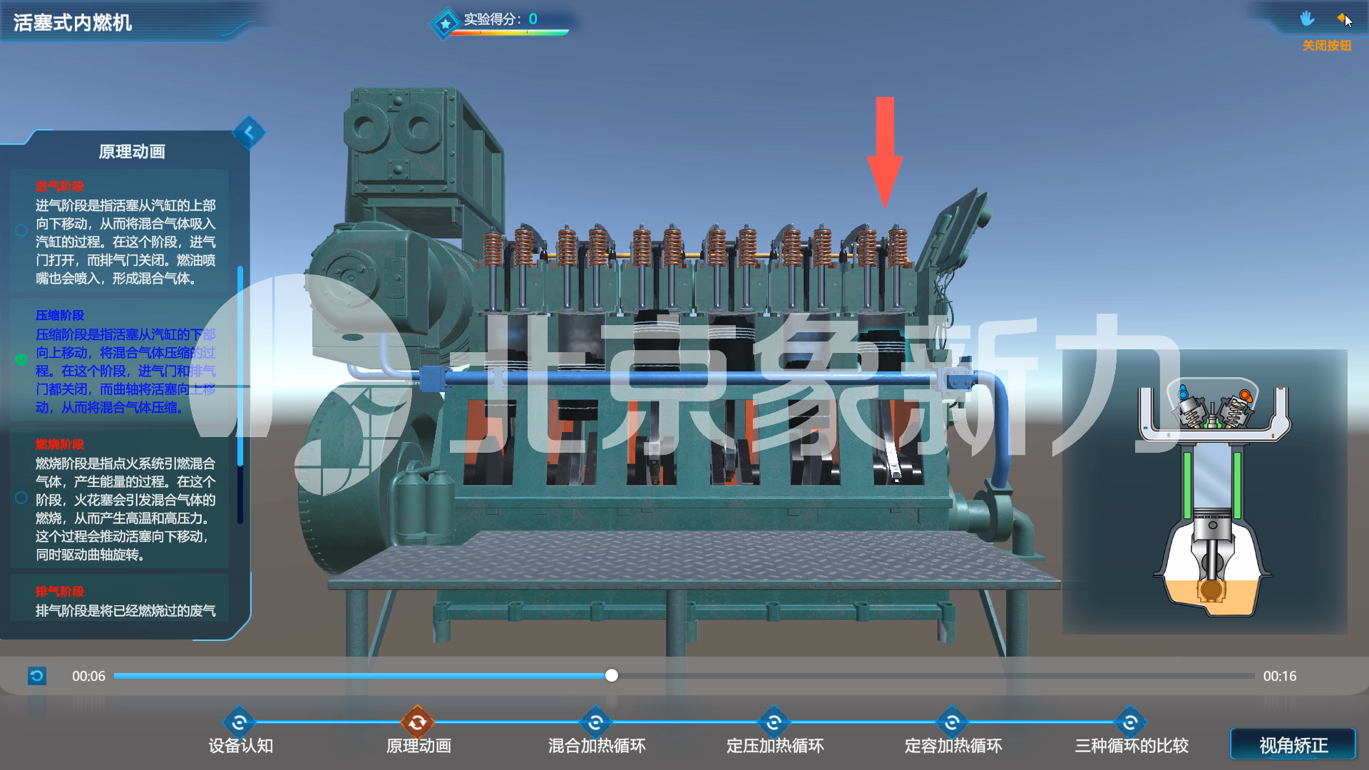 “活塞式内燃机”模块可学习设备结构、系统运行原理,可进行混合加热循环、定压加热循环、定容加热循环三种循环的性能参数的探索,并可在相同条件下,将三种循环进行比较。