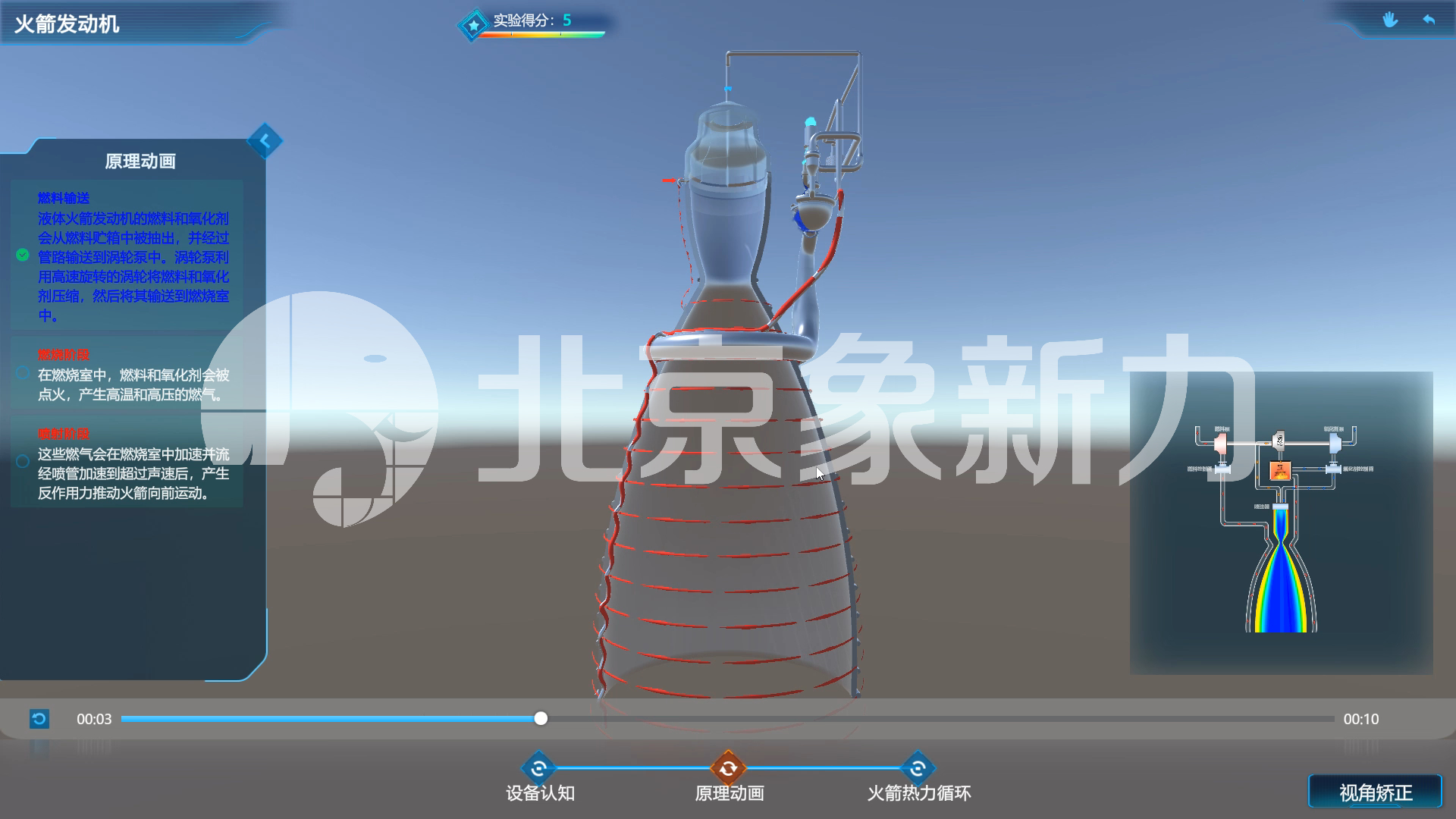 “火箭发动机”模块可学习火箭发动机设备结构、系统运行原理,可进行热力循环的性能参数的探索。