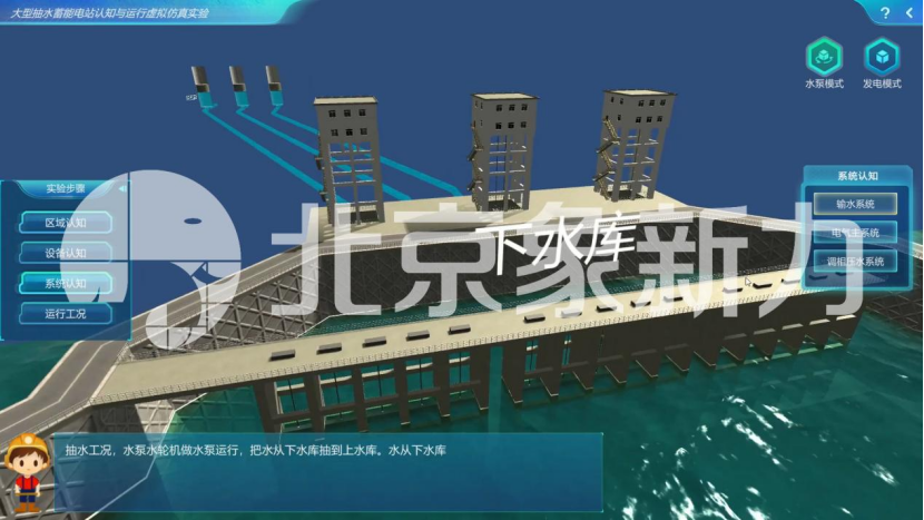 软件实验包括抽水蓄能电站区域认知、设备认知、系统认知、运行工况认知、发电运行操作、抽水运行操作六个模块。