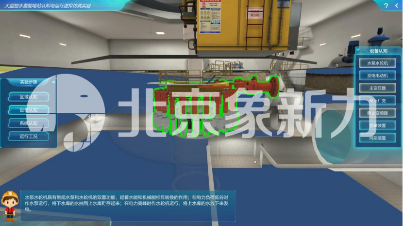 “设备认知”模块可学习水泵水轮机、发电电动机、主变等电气设备的功能和结构。