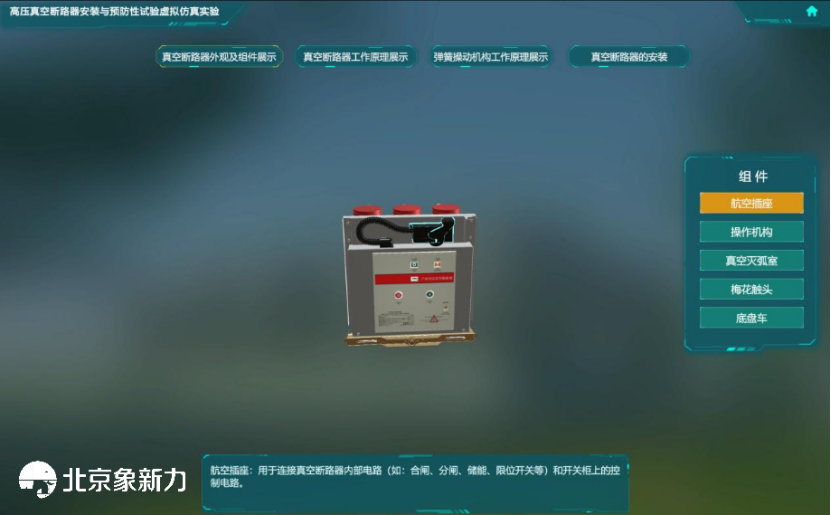 进入实验场景后,学习真空断路器的相关知识,包括真空断路器外观及组件展示、工作原理展示、弹簧操动机构工作原理展示及真空断路器的安装。