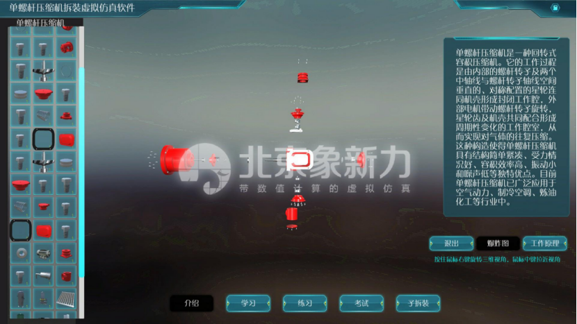 系统提供了活塞式、单螺杆式、双螺杆式、涡旋式、离心式这 5 种常见类型的压缩机供学生拆装学习。并且针对每种压缩机的拆装,都设置了介绍、学习、练习、考试 4 种模式。