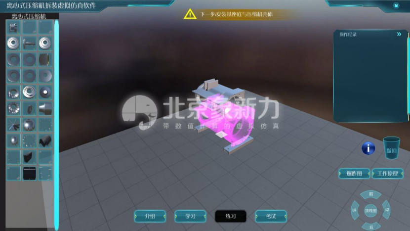 考试模式则在无操作提示和帮助的情况下,检验学生对压缩机拆装的掌握情况,操作完成后软件会给出评价。