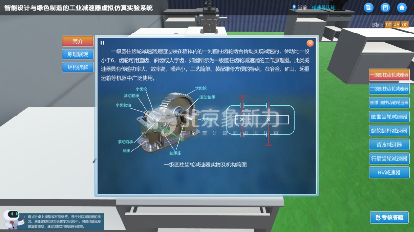 为帮助学生更好的学习减速器这类复杂机械系统,北京象新力研发了“智能设计与绿色制造的工业减速器虚拟仿真实验”,软件集减速器认知、齿轮设计、轴设计及减速器拆装于一体,依托先进的虚拟仿真技术,为师生提供一个高度沉浸式、交互式的学习与研发平台。