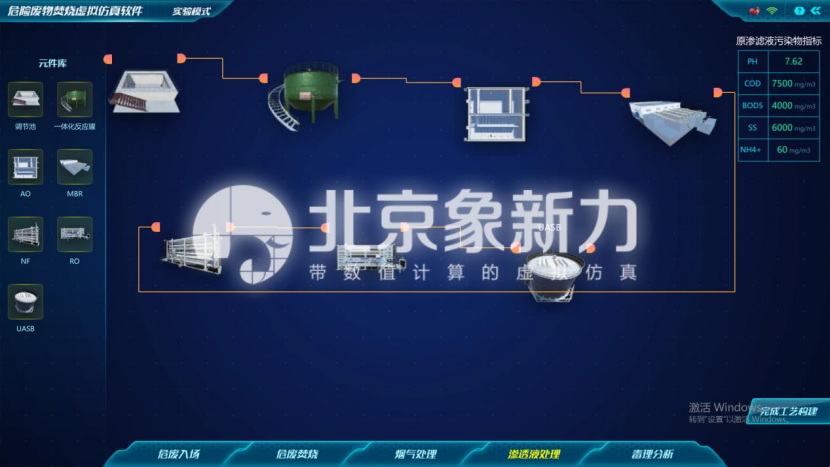 可通过渗滤液净化原理,在工艺单元库中选择合适的工艺模块,构建适合于不同特点渗滤液的净化流程,通过调节设备参数使渗滤液达到排放要求。