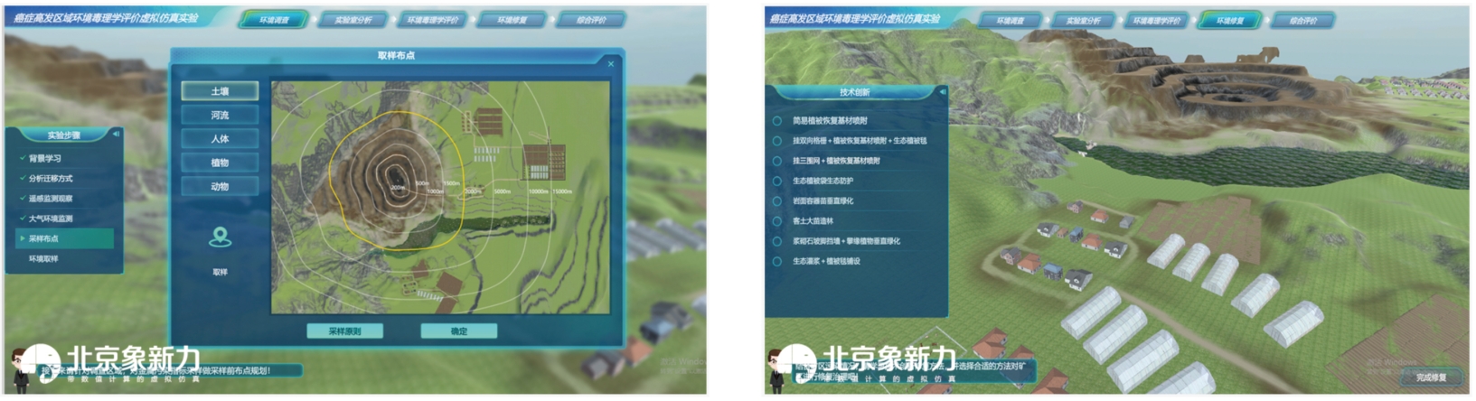 以癌症高发区及采矿区重金属污染为背景,场景中包含了矿区、河流、矿区周边的村庄、农田、动植物、家畜等内容。周边环境模拟真实自然环境,模拟环境中天气变化等过程。软件设计完整的环境毒理学检测、评价及对应的生态修复项目,开展环境生态修复虚拟仿真实验,将本专业分散的知识点串联成完整的系统工程,通过三维构建与数值模拟将系统设计、实施以及性能评价三方有机结合。