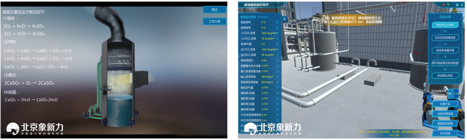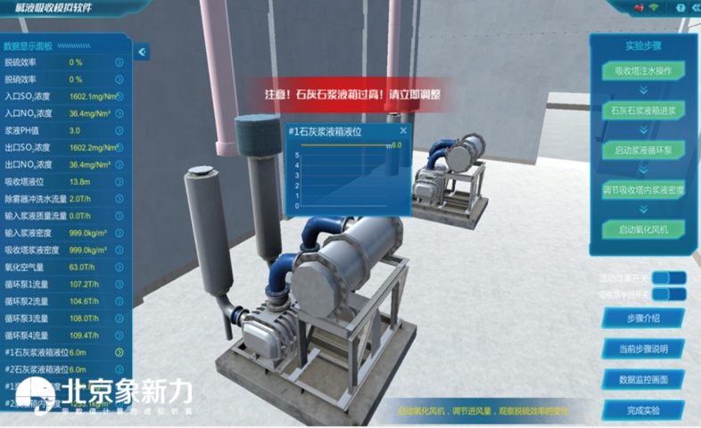 本项目通过对1000MQW电厂脱硫脱硝单元模拟,对吸收塔进行建模,以原理动画的形式,展示碱液吸收的过程。碱液吸收模拟的是火力发电厂烟气的石灰石-石膏法脱硫工艺过程,有详细的工艺介绍,实现了线下碱液吸收课程与大型脱硫脱硝工艺的结合,是理论知识与实际应用的结合,方便学生更好的掌握碱液吸收及脱硫脱硝的相关知识,同时对于工艺上的运行过程及设备有更深的认识。满足实操的教学需求。