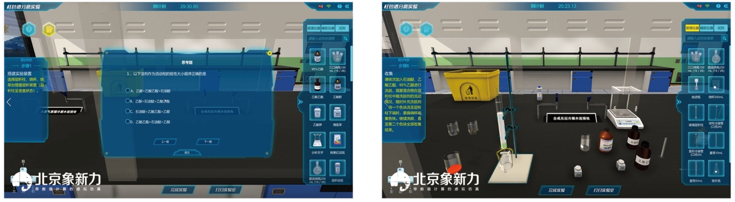 柱层析过程是有机化学合成反应过程中,用到的最基础的一种分离方式,也是十分常用和有效的一种分离手段。其实验装置简单,实验所需材料易得,但在化学学习过程中想要很好的利用柱层析过程,需要有比较牢固的有机化学理论知识,对于不同有机试剂能够判断其极性大小,对于产物有基本分析。对于层析柱的选择、装填高度的计算、固定相的选择以及流动相的选择等能够根据具体分离物进行设计。本软件在装置搭建、层析柱的装填与活化、流动相的选择等方面进行设计,并对偶氮苯和荧光黄的混合液进行分离,以此来展开对于柱层析过程的学习。
