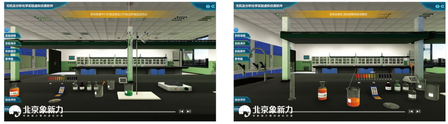 含铬(VI)废液的处理,属于无机及分析化学基础实验。在现有无机及分析化学虚拟仿真实验室内进行装置的搭建,其主要内容是在将铬(VI)离子还原成三价铬离子,然后测定含铬(VI)离子溶液的吸光度,并通过标准曲线法得到预处理之后六价铬的浓度,最后计算处理前后铬(VI)的浓度。
