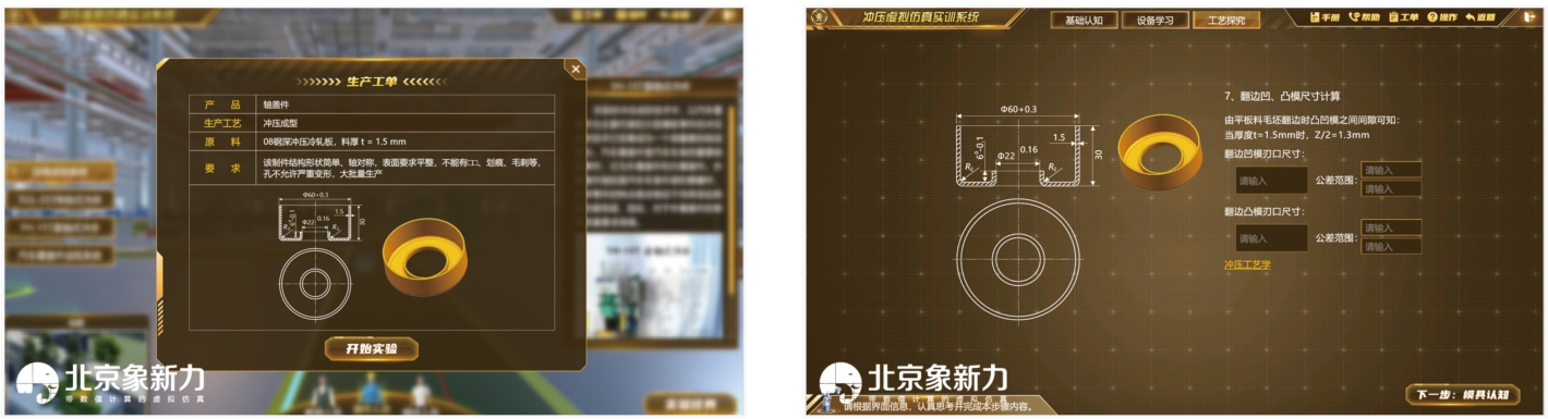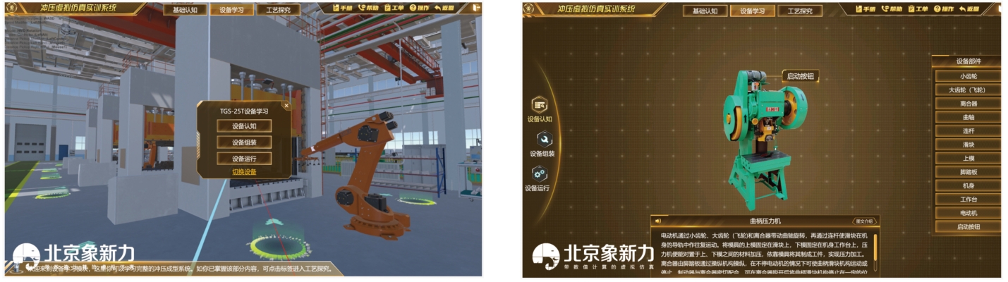 学生通过本系统可在虚拟的冲压环境中进行冲压成型的理论学习、操作训练和实验考核,本冲压虚拟仿真实训系统各操作流程符合真实冲压车间逻辑。通过本冲压虚拟仿真实训系统的学习,可完整了解冲压成形的模具结构、设备结构及工艺流程,熟悉各流程的关键工艺要点,掌握相应的知识点。