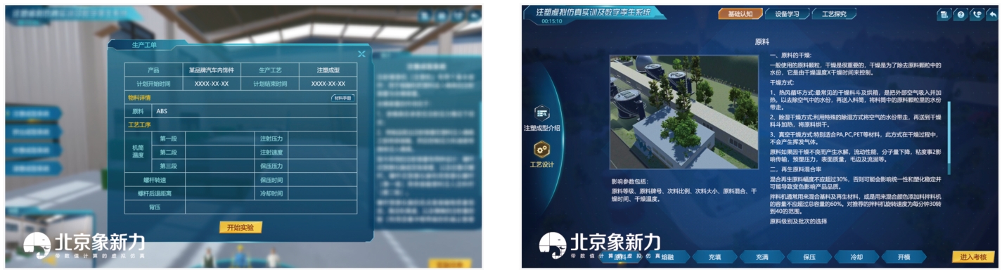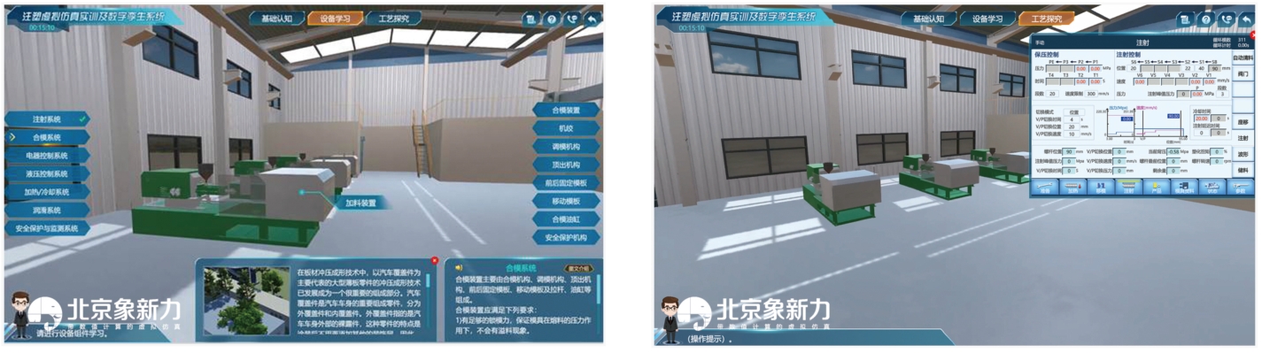 学生可在虚拟的注塑环境中进行注塑成型的理论学习、操作训练和实验考核操作训练,本注塑虚拟仿真实训系统各操作流程符合真实注塑成型车间逻辑,与真实注塑场景相符合。通过本注塑虚拟仿真实训系统的学习,完整了解注塑模具结构及工艺流程,熟悉各流程的关键工艺要点,掌握相应的知识点。