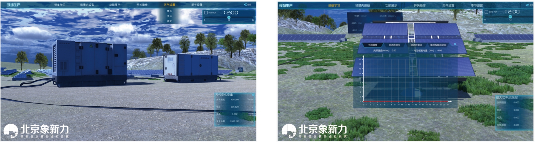 光伏发电系统培训软件场景以光伏电站为背景,有太阳能电池板、蓄电池室,并网逆变器、变压器、汇流箱等设备,以第一人称进行光伏电站场景漫游,可以查看到各个设备的设备原理、主要作用以及应用场景等知识点。该软件以生产流程和设计光伏电站实验展开学习。学生可以先通过课程学习模块学习到光伏发电系统发电流程、光伏电池组件与光伏方阵、光伏控制器和逆变器、储能电池及器件等相关知识;可进行设备的虚拟安装、最大功率追踪实验和并网实验。