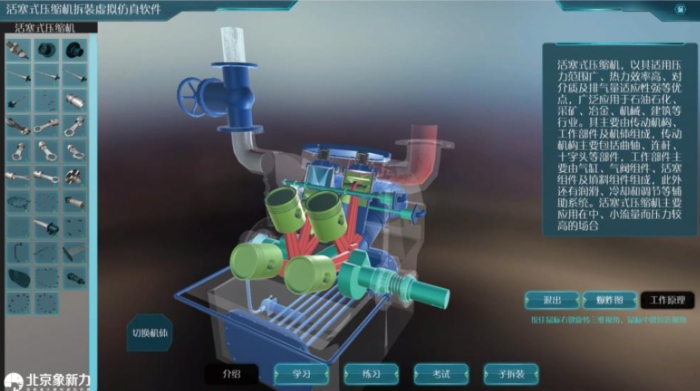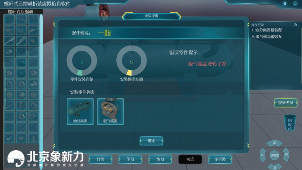 软件可达到交互操作效果,使用者在场景中进行相应的操作,如:压缩机零件的装配与拆卸,查看考试模式下的评分评价。