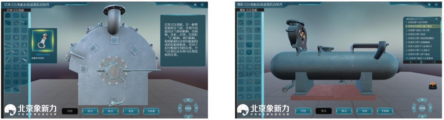 多方位观察压缩机的外形结构,查看设备各组成零件。同时,界面会根据实验操作进行相应的文字解说,了解设备零部件的功能。