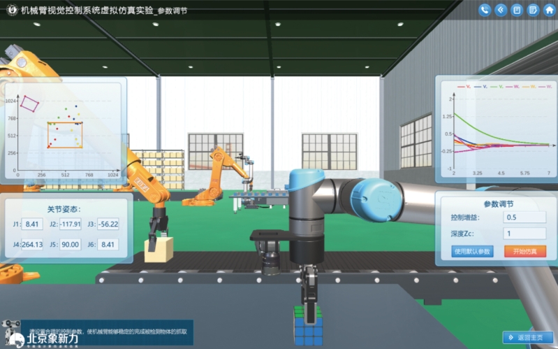 3、学生通过本仿真平台的学习及实验操作,可熟悉机械臂视觉控制系统的设计、控制等环节。掌握相应设备仪器的选择使用及控制系统设计与搭建相关知识。