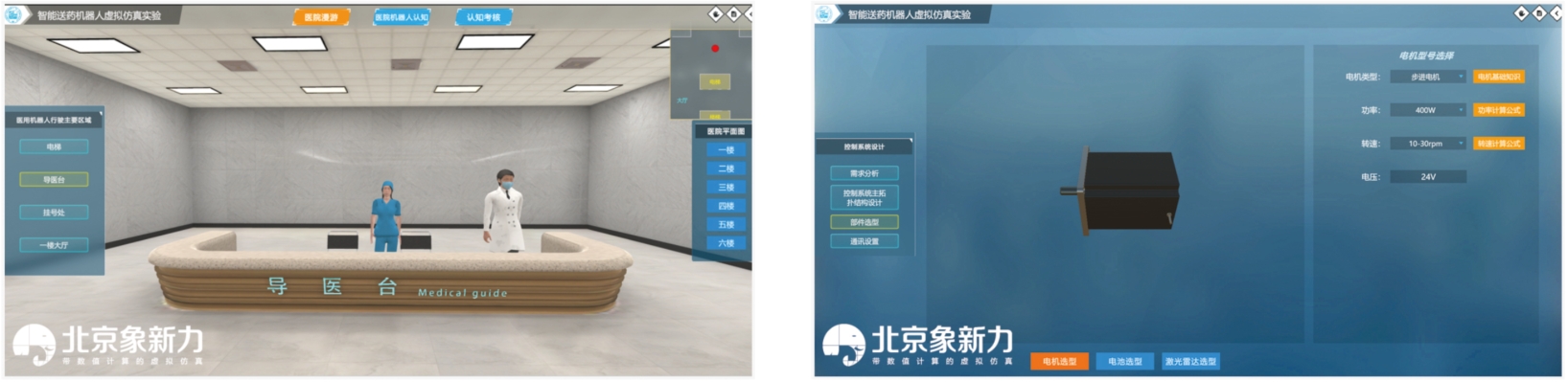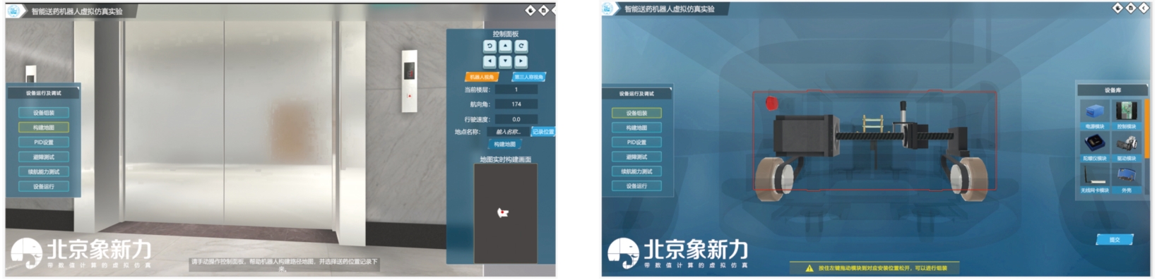 本虚拟仿真实验项目以隔离医院为背景,智能送药机器人为主线,将智能送药机器人认知、控制系统设计、通讯设置、智能路径规划等进行综合设计,将各过程相关基本理论、基本操作、设备结构等知识贯穿于操作全过程。本项目依托真实医院智能机器人工程,由浅到深,循序渐进,从学生实践需求出发,构建了认知学习、控制系统设计、构建地图、PID设置等多个模块实验教学内容。