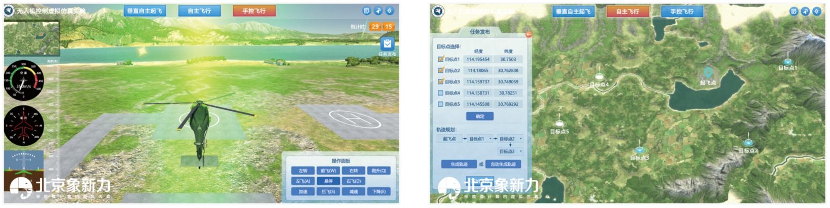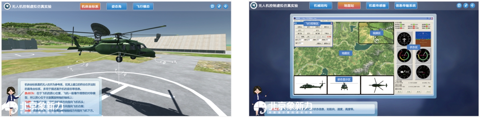 本实验以无人直升机为研究对象,进行了三维场景与设备的详细仿真,实验内容包括基础认知、结构介绍、飞行控制三个环节。其中,基础认知环节是对直升机的机体坐标系、姿态角、飞行模态等知识进行了解掌握,为最终的无人直升机飞行控制操作打下基础;结构介绍环节包含了对直升机的机械结构介绍,对地面站界面各功能区的介绍,机载传感器和信息传输系统的学习与考核,充分展现无人直升机的组成结构;飞行控制环节,以任务导向模式,进行自主飞行控制与手控飞行控制,在达到目标的过程中,掌握对无人直升机的控制操作。