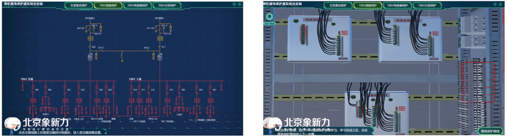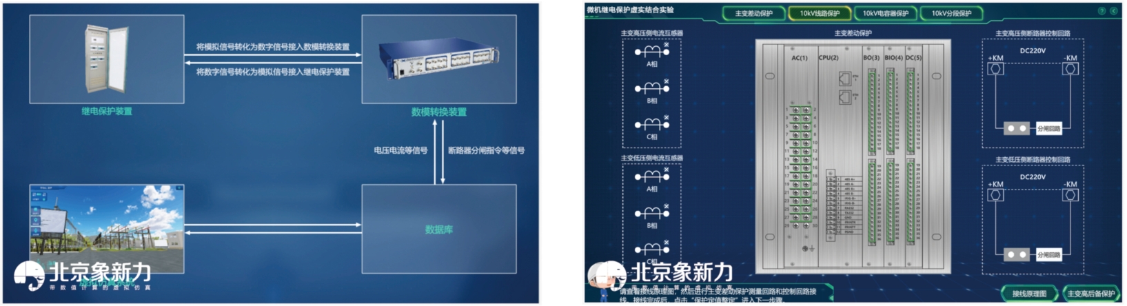 继电保护装置和虚拟三维变电站仿真实验系统进行虚实结合通讯,来实现数据的传递与交换。虚拟仿真实验系统支持多种类型的数据通讯,如Modbus、ModbusTCP、OPC、TCP/IP、电力104规约、IEC61850等。可以实现多种类型微机继电保护装置虚实结合实验,包含保护原理学习、继电保护装置二次接线、保护定值整定、故障设置、故障录波、实验记录等环节。