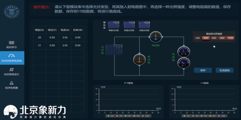 本软件学习电池组件的构成、制备过程,光伏系统的各组成部分等基础知识,再通过实验方法掌握不同组件的光伏特性,并从中了解其开路电压、短路电流、填充因子和转换效率等重要参数。其次,根据不同场景实际负载的需求,上海市每个月阴雨天气数和日平均用电量,计算出需要的蓄电池的容量。根据蓄电池的型号参数,计算出蓄电池的数量,并进行安装。最后,学生以上述条件自行设计一套能够满足各项要求的光伏发电系统,并能根据此系统进行必要的经济性测算。