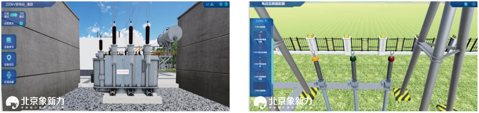 软件模拟变电站的整体场景(220KV变电站),包括220kV设备区、110kV设备区、35KV设备区;电气设备(例如变压器、断路器、隔离开关、互感器等)的模拟能够进行外观模拟和内部结构模拟,且能够进行模拟运行操作。实验场景依托Maya软件高精度建模技术构建,学生在电脑上能体验在虚拟场景中漫游,身临其境的查看运行设备,从部分到整体全面了解整个布局结构、设备组成、设备用途、设备连接、系统组成等。