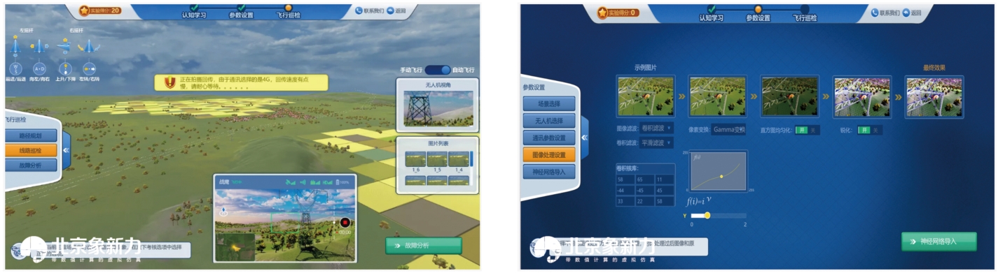 本虚拟仿真实验以多种天气情况下无人机智能巡检为研究对象,利用信号处理新技术解决电力线路故障检测问题。主要内容包括输电线路,无人机,通信方式及图像处理认知、无人机智能巡检参数配置和巡检及故障检测和分析等内容,结合虚拟仿真技术与通信及信号处理理论知识,提供开放的交互式实验平台。虚拟仿真实验采用三维虚拟仿真技术,将多种气候条件下不同地形下的电力线路巡检全方位展示处理。系统中的线路杆塔、导线、绝缘子、线路金具、拉线、杆塔基础、接地装置、无人机等设备,均与实际物理设备具有相同的参数。