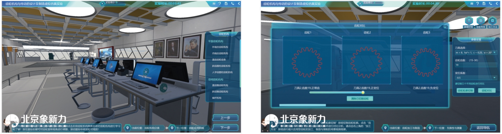 齿轮机构适用范围很广,实验利用逼真形象的三维模型仿真,真实可靠的底层数学模型代码,结合参数设定等富有特色的人性化交互界面,加深学生对平面和空间齿轮机构的结构、齿轮的基本参数、齿轮几何尺寸计算公式、齿轮传动、范成法加工齿轮、形位公差、齿轮公差组等知识的认知和理解,培养学生的知识应用能力、综合实践能力、思维判断与分析能力、总结概括能力以及创新精神和科学严谨的工作态度。