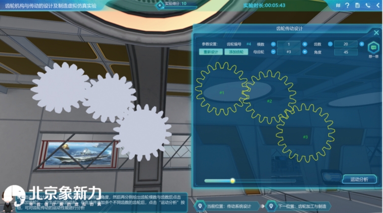 实验设定了包含齿轮机构学习、应用介绍、机构分析、传动系统设计、加工制造、测量检测、分析、验证等多个环节。学生在学习及实验过程中,由被动变主动。实验充分利用了虚拟仿真实验的“虚拟”特点,具有可视性、可说性及可测性,激发学生的研究兴趣和创新能力。内容设计上按照由简单到复杂,由基础学习到系统设计验证的原则,学生上手容易,操作方便,学习效率高,在此基础上,设置了综合评价分析等环节,引导学生主动去分析、理解各个知识点之间的复杂关联关系。通过知识交互式学习、方案自主设计、仿真运行验证和综合分析反馈等环节,实现以学生为中心的自主探究式学习。