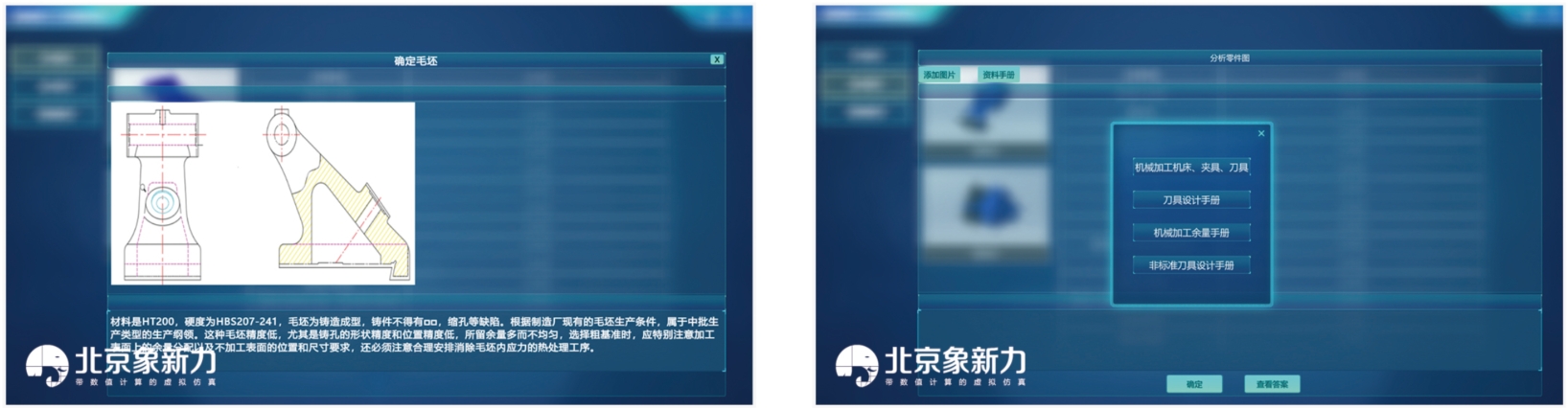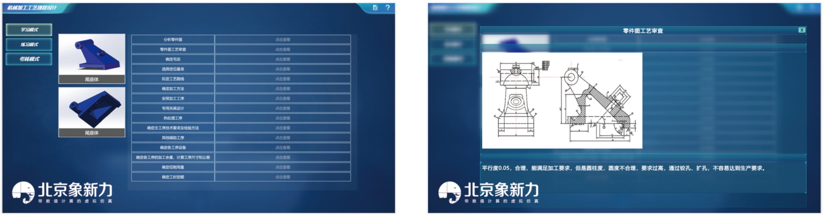 以学、练、考三种模式,将机械加工工艺规程设计流程,包含分析零件图、零件图工艺审查、确定毛坯等各步 骤进行学习了解掌握,辅助课堂教学,提高教学质量。