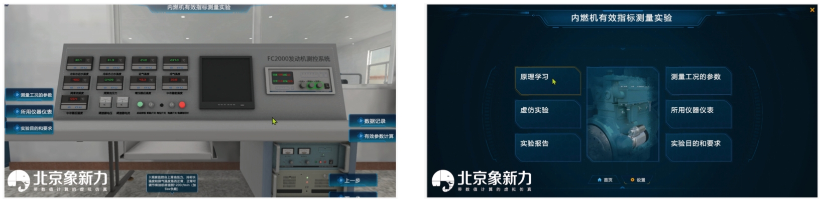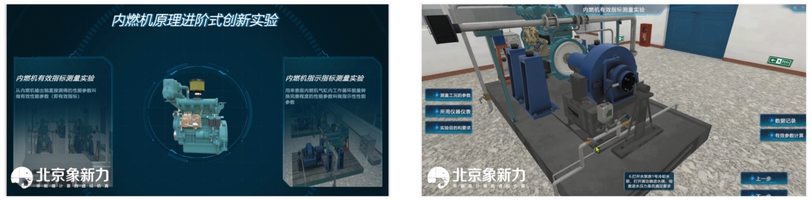 实验以真实实验室设备及场景为对象,通过虚拟仿真操作的实现对设备的基本原理及使用方法、实验前的准备工作、启动、加负载、测量与记录、卸载与停机、、实验数据整理分析、实验报告提交等操作步骤的模拟。同时嵌入设备手册、工作原理说明等信息,以三维仿真模型及图文结合的方式,实现对设备结构及使用的高效实验教学。实验以实时仿真数据模型为后台,数学模型严格遵循相应的公式及原理,和三维虚拟现实技术相联系,可通过发动机启停、开关调节等基本操作过程修改数学模型的参数,并实时计算和显示压力、温度等参数。