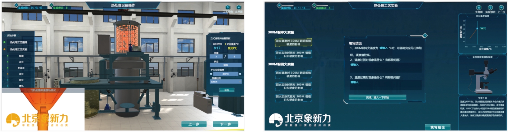 本飞机起落架热处理工艺控制虚拟仿真实验主要分为结构及原理学习、热处理仿真实验、设备虚拟仿真操作模拟三大模块,最终以实验报告形式展现学生的实验过程及结果。根据对应的模块内容,软件设计了"实验前知识学习”、“场景漫游”、"工艺搭建"、“设备搭建”、"虚拟仿真操作实验"等多个实验环节。通过实验的仿真操作及学习,使学生对热处理设备的基本结构及使用、飞机起落架零件热处理工艺过程以及300M钢的相应材料性能等多方面知识内容进行深入的学习了解。并通过考核答题、智能评价系统,最终以实验报告的形式对学生的知识学习及掌握情况进行全面的展现,教师可通过网络平台管理功能,查看所有学生的实验报告详情。