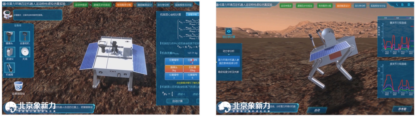 本虚拟仿真实验以四足机器人的总体力学设计为目标,从《理论力学》课程的基本概念和方法出发,研究四足机器人在地外星球表面行走时的重要力学特性。学生通过虚拟实验可以改变系统的几何参数、材料参数、机身负载、机器人行走环境、典型路况等,从而作出合理运动规划。通过本虚拟系统仿真,检验运动规划是否能使机器人实现预期运动。在此基础上,通过虚拟仿真,检验参数选择和运动规划的可行性。