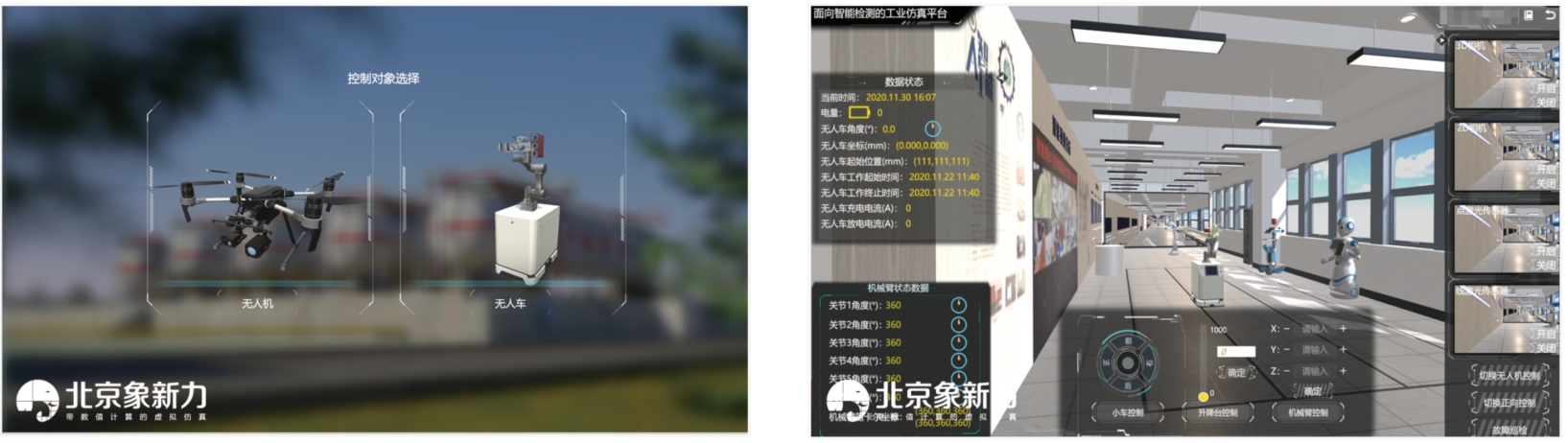 在无人机/无人车控制模拟、巡检过程中,虚拟系统实时获取无人机/无人车位置信息、状态数据信息及巡检信息。实验过程为虚拟结合控制模式,分为正向和逆向控制两种方式,正向模式下,实验人员操控现场无人机/无人车,同时将无人机/无人车速度、位置、时间、状态、相机拍摄信息等信息发送给系统,在虚拟场景内展现出对应的巡检信息,虚拟场景中无人机/无人车跟随运动,实时显示相应的状态信息;逆向模式下,由软件发送控制信息,遥控现实无人机/无人车运动,实现虚实结合的映射。