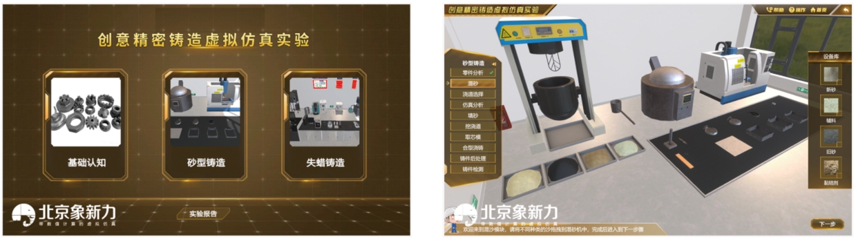 通过虚拟仿真技术,逼真再现铸造现场场景,对生产流程进行工艺拆解;为学生提供安全、全面的铸造实践教学。采用"虚实结合、相互结合,能实不虚"的线上线下混合式教学,将创新教育和工程教学有机结合,使学生的实践能力、创新能力得到锻炼,培养符合时代发展需要的新工科应用型人才。