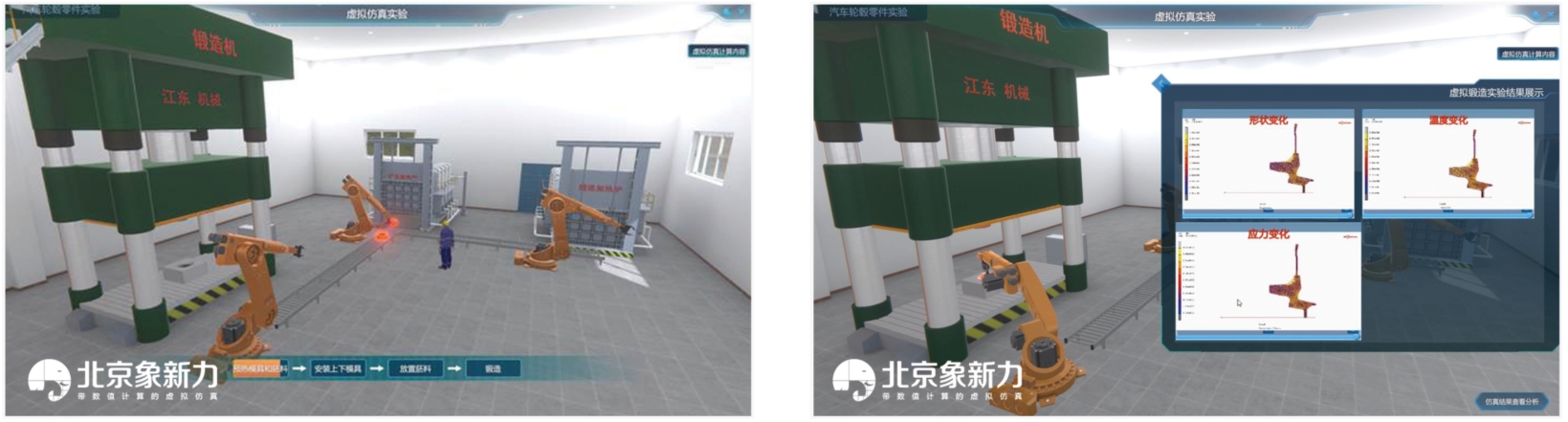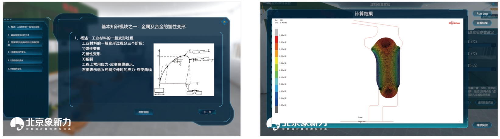 本实验项目以真实实验室设备及场景为对象,完全还原实验细节,将锻造实验操作的流程场景虚拟与测试结果仿真计算相结合。学生在虚拟实验平台上学习实验原理及操作方法,同时掌握各种锻造指标及不同材料的性能差异。