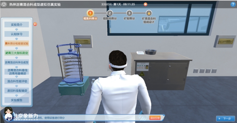 本实验设计循序渐进,在步骤上先进行集料筛分实验,通过集料筛分实验来进行混合料组成设计,根据设计结果来完成沥青混合料成型实验,最后进行试样的体积指标测定和性能评估。在虚拟仿真试验上,分解为实验认知、实验引导、实验操作考核和结果计算等教学模块,支持二维页面互动和三维场景互动,掌握基础知识与原理,学习集料筛分-组成设计-性能评估-结果计算的实验流程和操作。