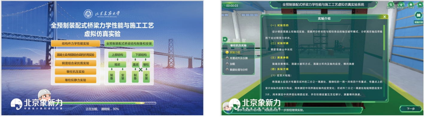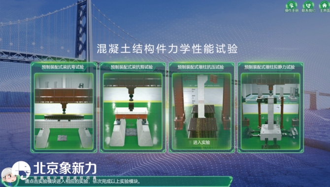 本实验教学过程中,力学性能测试成本耗费巨大,试验周期长,存在一定的危险性;施工工艺往往只能通过老师的讲解和视频学习,很难进行完整的试验过程。开发设计此全预制装配式桥梁力学性能与施工工艺虚拟仿真试验系统,学生通过实验的学习,掌握预制装配式梁抗弯试验、预制装配式梁抗剪试验、预制装配式墩柱抗压试验、预制装配式墩柱拟静力试验,全预制装配式桥梁构件上部结构制备全过程、下部结构制备全过程、上部结构的安装、下部结构的安装。实验通过交互性实验步骤操作以及参数设定等步骤,加深学生对相应知识的认知和理解,丰富学生的想象力,提升实验教学效率。