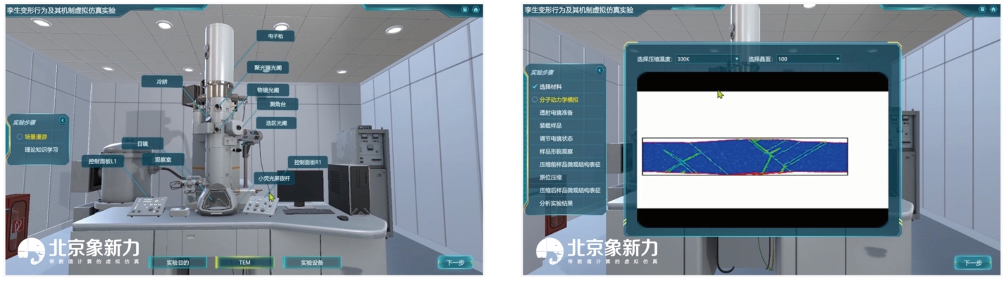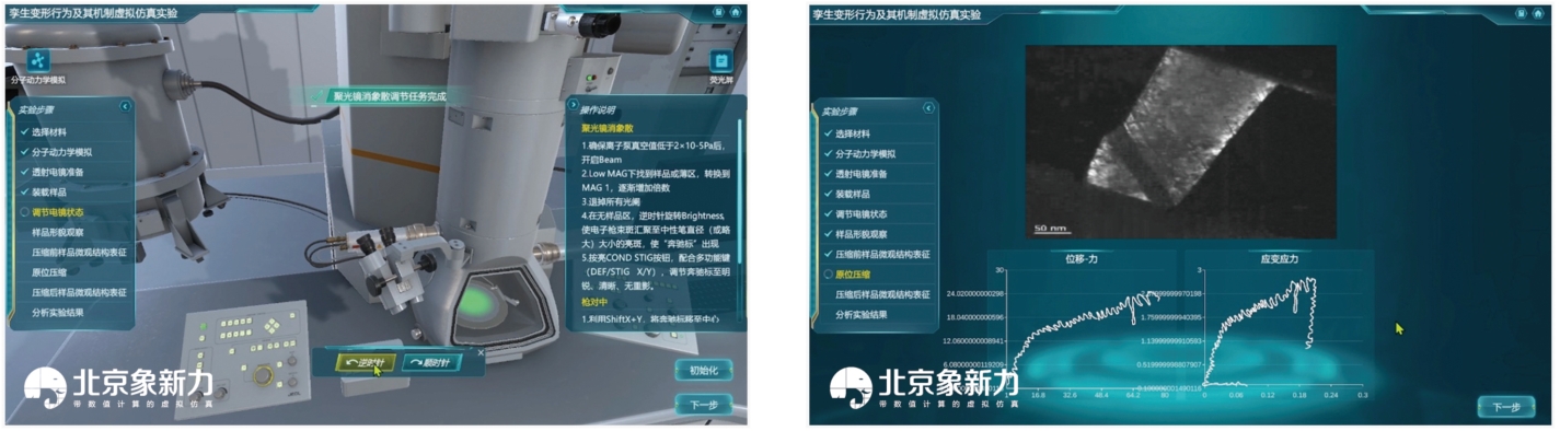 本虚拟仿真实验软件旨在通过纳米单晶样品在孪生位向原位压缩的虚拟仿真实验、结合孪生变形的分子动力学模拟计算,使学生在实验操作上能够掌握聚焦离子束加工制备样品、透射电镜下开展原位压缩实验、透射电镜下原位观察变形过程;在理论上能够通过分子动力学模拟结果,分析对比并理解孪生变形的发生条件与分位错滑移机制,从理论和实验两个方面深理解孪生变形行为及其机制。