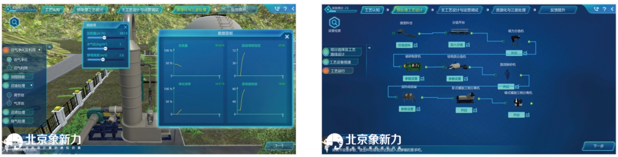 工程进阶:本软件的核心部分,包括预处理工艺设计、主工艺设计与运营调试、资源化与三废处理等,学生通过选择垃圾组分、设计预处理工艺路线、厌氧主工艺设计及运营调节、沼气资源化、沼液、沼渣和臭气处理等学习不同工艺单元衔接、设备调试规律等。