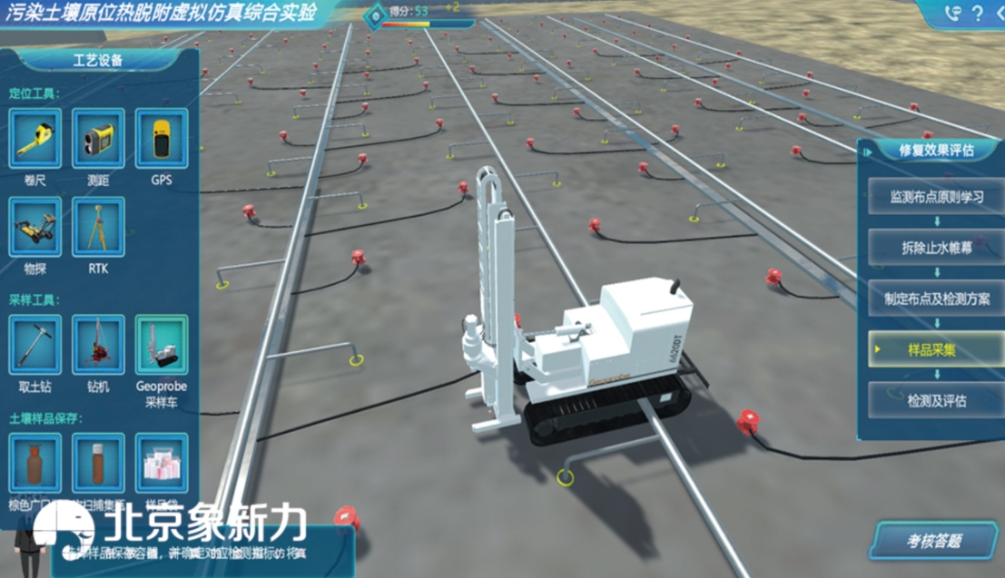 本项目三维模型根据实际有机污染场地(农药厂)原型,以原位热脱附技术施工、运行及修复后效果评估为基础进行建模。软件实施内容包括污染场地信息了解、修复工艺施工、修复运行、修复效果评估及考核等,旨在加强学生对污染土壤原位热脱附技术的关键步骤、影响因素,工艺设备施工、工艺运行以及修复后效果评估的布点要求和评估方法等方面实践能力的提升。