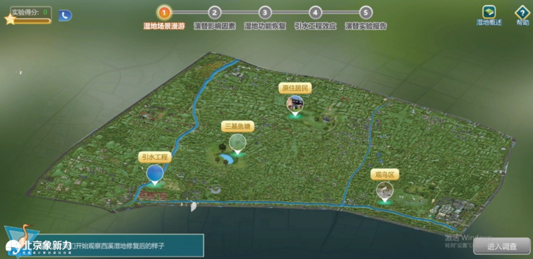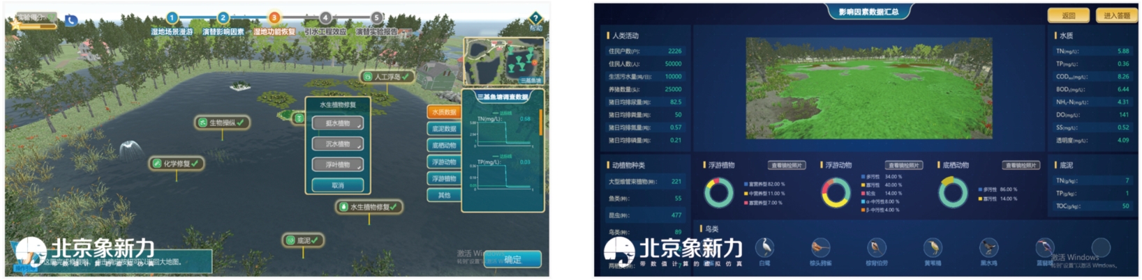 本项目以真实城市湿地及周边环境为原型进行三维建模,包含湿地场景漫游、湿地生态调查、湿地功能修复、引水工程效应和演替实验报告五大实验模块。实验模拟利用工程措施对城市湿地进行生态修复,主要包括引水工程、外源污染控制、底泥疏浚、植物修复、生物操纵、生境改造等修复措施和技术手段。