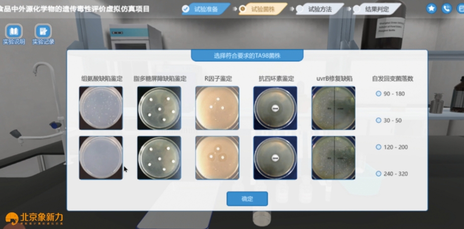 (2)软件以三维动画展示实验过程,用户在场景中可以通过动画直观感受遗传毒性实验操作过程,通过三维交互了解重要步骤的操作流程;